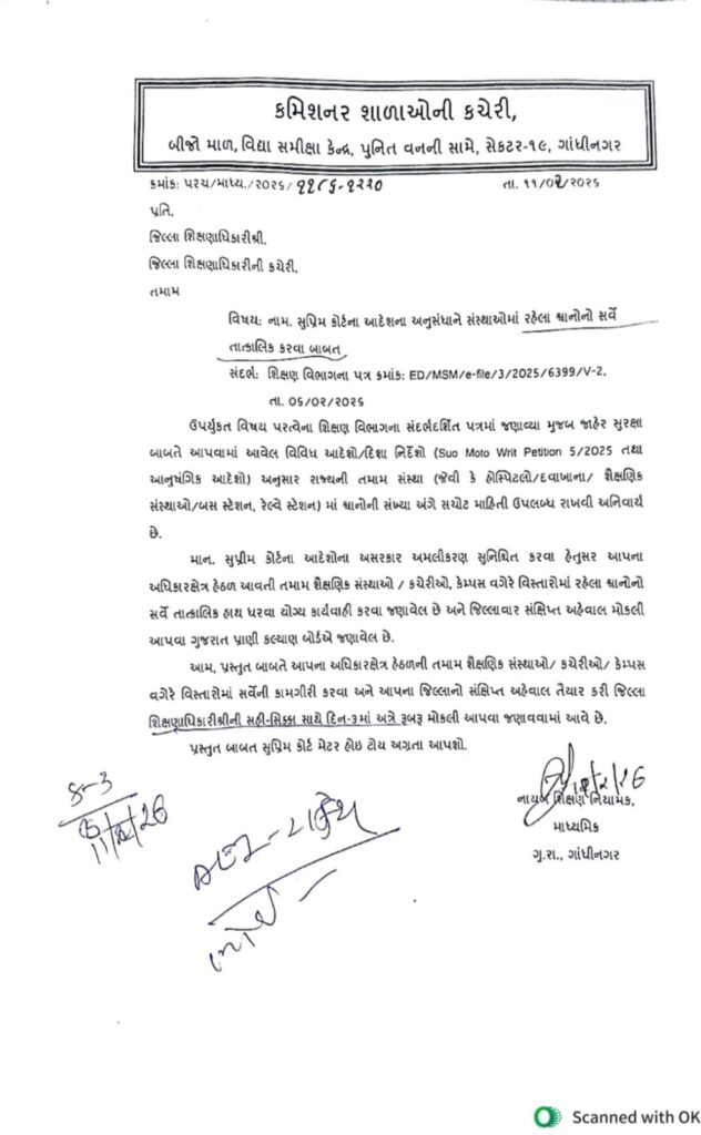 આ આદેશ સુપ્રીમ કોર્ટમાં ચાલી રહેલી સુઓમોટો જાહેર હિત અરજી 5/2025ના સંદર્ભમાં આપવામાં આવ્યો છે. જેનો મુખ્ય હેતુ શૈક્ષણિક પરિસરો ઉપરાંત જાહેર સ્થળોને રખડતાં શ્વાનથી સુરક્ષિત રાખવાનો છે. માત્ર શાળાઓ જ નહીં, પરંતુ હૉસ્પિટલો, બસ સ્ટેશનો અને રેલ્વે સ્ટેશન જેવા જાહેર સ્થળો પર પણ શ્વાનોની સ્થિતિ અંગે સચોટ ડેટા તૈયાર કરવા પર ભાર મૂકવામાં આવ્યો