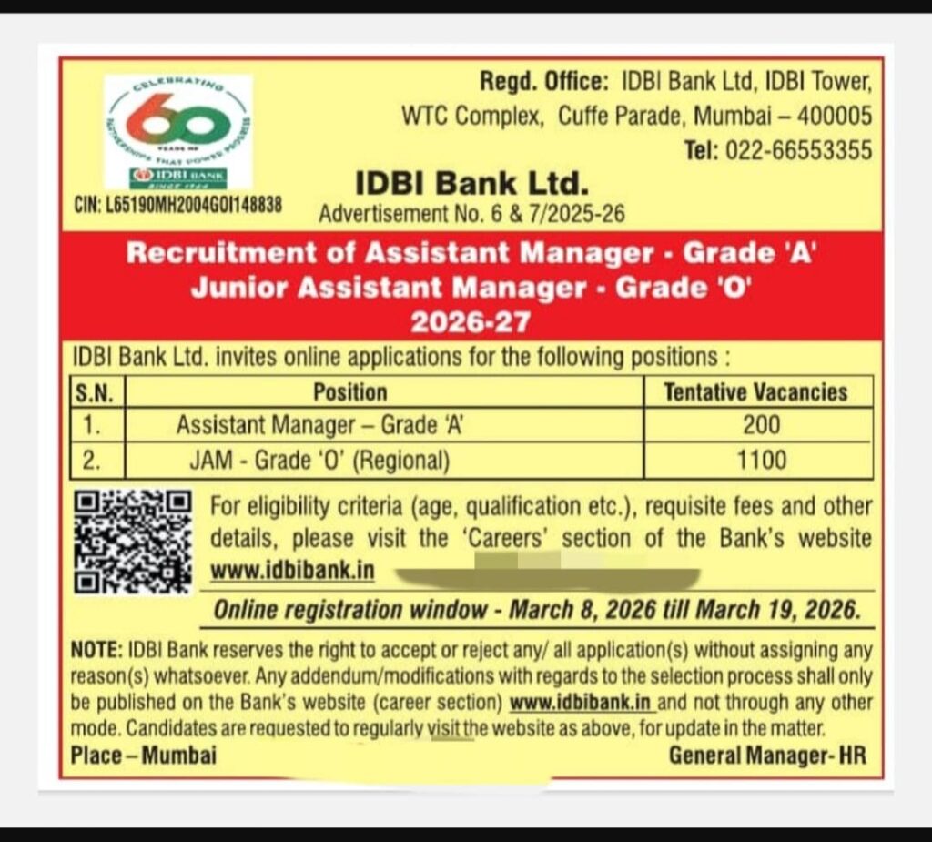IDBI Bank Ltd. has officially released recruitment advertisements No. 6 & 7/2025-26 inviting applications for Assistant Manager (Grade ‘A’) and Junior Assistant Manager – JAM (Grade ‘O’) positions for the recruitment year 2026-27.