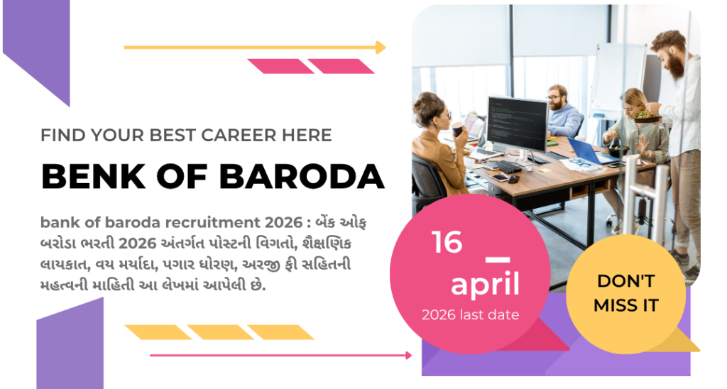 bank of baroda recruitment 2026 : બેંક ઓફ બરોડા ભરતી 2026 અંતર્ગત પોસ્ટની વિગતો, શૈક્ષણિક લાયકાત, વય મર્યાદા, પગાર ધોરણ, અરજી ફી સહિતની મહત્વની માહિતી આ લેખમાં આપેલી છે.