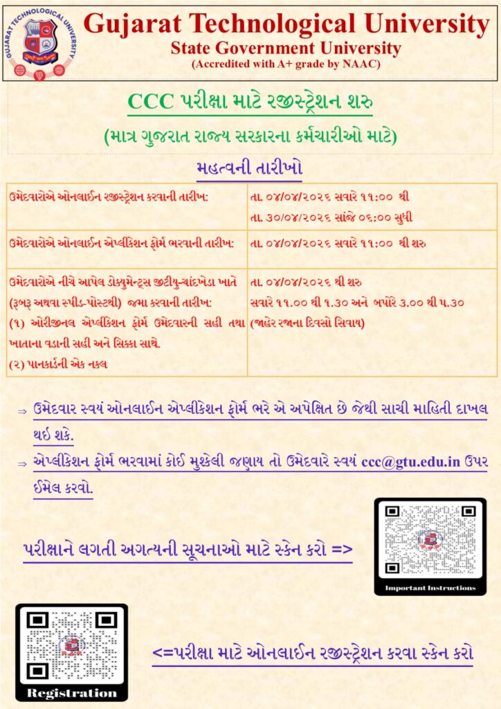 GTU CCC (Course on Computer Concepts) એ એક મહત્વપૂર્ણ કોમ્પ્યુટર કોર્સ છે, જે ખાસ કરીને સરકારી નોકરી, પ્રમોશન અને ડિજિટલ સ્કિલ માટે જરૂરી બને છે. આ કોર્સમાં બેઝિક કોમ્પ્યુટર જ્ઞાન આપવામાં આવે છે જેમ કે MS Office, Internet, Email, અને Digital Services. આજના સમયમાં ડિજિટલ યુગમાં આ કોર્સ દરેક માટે ઉપયોગી છે.