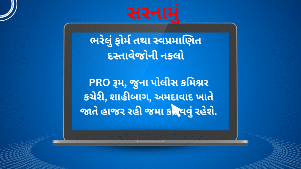અરજી ફોર્મ 25 ઓગસ્ટથી 20 સપ્ટેમ્બર 2025 દરમિયાન દરરોજ સવારે 11:00 થી સાંજે 06:00 વાગ્યા સુધી સ્વીકારવામાં આવશે. ઓનલાઈન ફોર્મ પોલીસ વિભાગની અધિકૃત વેબસાઈટ https://cpahmedabad.gujarat.gov.in/ પરથી ડાઉનલોડ કરી શકાય છે. ભરેલું ફોર્મ તથા સ્વપ્રમાણિત દસ્તાવેજોની નકલો સાથે PRO રૂમ, જુના પોલીસ કમિશ્નર કચેરી, શાહીબાગ, અમદાવાદ ખાતે જાતે હાજર રહી જમા કરાવવું રહેશે.