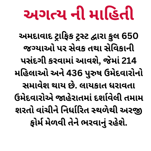 અમદાવાદ ટ્રાફિક ટ્રસ્ટ દ્વારા કુલ 650 જગ્યાઓ પર સેવક તથા સેવિકાની પસંદગી કરવામાં આવશે, જેમાં 214 મહિલાઓ અને 436 પુરુષ ઉમેદવારોનો સમાવેશ થાય છે. લાયકાત ધરાવતા ઉમેદવારોએ જાહેરાતમાં દર્શાવેલી તમામ શરતો વાંચીને નિર્ધારિત સ્થળેથી અરજી ફોર્મ મેળવી તેને ભરવાનું રહેશે.