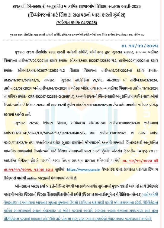 શિક્ષણ સહાયકની ખાસ ભરતી ઝુંબેશ અંતર્ગત દ્વિસ્તરીય TAT(S)-2023 આધારિત મેરિટના ધોરણે પસંદગી યાદી તથાં પ્રતિક્ષા યાદી તૈયાર કરવા નિયમ લાયકાત ધરાવતા ઉમેદવારો પાસેથી 12 નવેમ્બરથી 21 નવેમ્બર, 2025ની રાત્રે 23:59 વાગ્યા સુધી સત્તાવાર વેબસાઈટ gserc.in પરથી ઓનલાઈન અરજી કરી શકાશે.