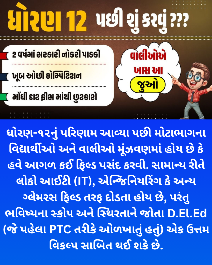 ધોરણ-૧૨નું પરિણામ આવ્યા પછી મોટાભાગના વિદ્યાર્થીઓ અને વાલીઓ મૂંઝવણમાં હોય છે કે હવે આગળ કઈ ફિલ્ડ પસંદ કરવી. સામાન્ય રીતે લોકો આઈટી (IT), એન્જિનિયરિંગ કે અન્ય ગ્લેમરસ ફિલ્ડ તરફ દોડતા હોય છે, પરંતુ ભવિષ્યના સ્કોપ અને સ્થિરતાને જોતા D.El.Ed (જે પહેલા PTC તરીકે ઓળખાતું હતું) એક ઉત્તમ વિકલ્પ સાબિત થઈ શકે છે.