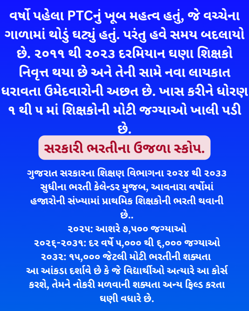 વર્ષો પહેલા PTCનું ખૂબ મહત્વ હતું, જે વચ્ચેના ગાળામાં થોડું ઘટ્યું હતું. પરંતુ હવે સમય બદલાયો છે. ૨૦૧૧ થી ૨૦૨૩ દરમિયાન ઘણા શિક્ષકો નિવૃત્ત થયા છે અને તેની સામે નવા લાયકાત ધરાવતા ઉમેદવારોની અછત છે. ખાસ કરીને ધોરણ ૧ થી ૫ માં શિક્ષકોની મોટી જગ્યાઓ ખાલી પડી છે.