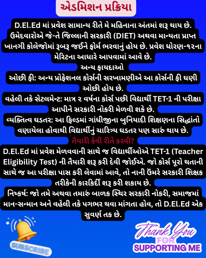 નિષ્કર્ષ: જો તમે અથવા તમારું બાળક સ્થિર સરકારી નોકરી, સમાજમાં માન-સન્માન અને વહેલી તકે પગભર થવા માંગતા હોવ, તો D.El.Ed એક સુવર્ણ તક છે.