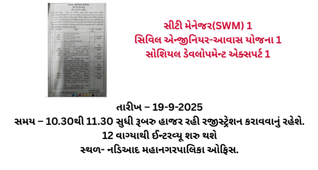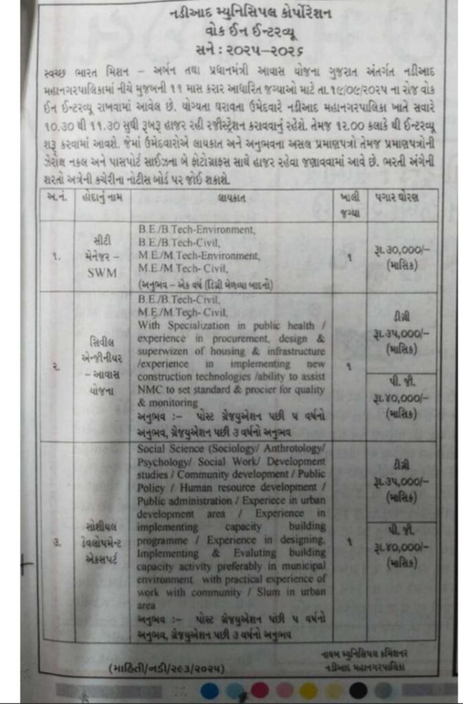 સ્વચ્છ ભારત મિશન – અર્બન તથા પ્રધાનમંત્રી આવાસ યોજના ગુજરાત અંતર્ગત નડીયાદ મહાનગરપાલિકામાં 11 માસ કરાર આધારિત જગ્યાઓ માટે 19-9-2025ના રોજ વોક ઈન ઈન્ટરવ્યુ રાખવામાં આવ્યું છે. પોસ્ટ અને જગ્યાની વિગતો નીચે આપેલી છે.