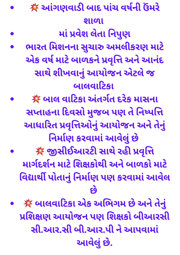 • 💥 બાલવાટિકા એક અભિગમ છે અને તેનું પ્રશિક્ષણ આયોજન પણ શિક્ષકો બીઆરસી સીઆરસી બીઆરપી ને આપવામાં આવેલું છે.