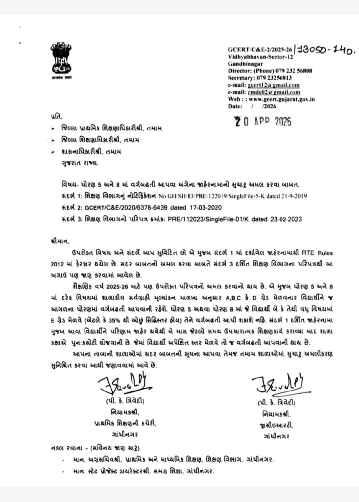 આમ, વર્ષ 2019-20 થી, ધોરણ 5 અથવા ધોરણ 8 માં જે વિદ્યાર્થી બે કે તેથી વધુ વિષયમાં E ગ્રેડ મેળવે(એટલે કે 35%થી ઓછું સિદ્ધિસ્તર હોય) તેને જે તે ધોરણમાંથી વર્ગબઢતી આપી શકાશે નહીં. પરંતુ પરીક્ષાનું પરિણામ જાહેર થયાના બે માસ દરમિયાન ઉપચારાત્મક શિક્ષણ કાર્ય કર્યા બાદ શાળાકક્ષાએ પુન:કસોટી યોજવાની રહેશે જેમાં વિદ્યાર્થી પોતાના ગ્રેડમાં અપેક્ષિત સુધારો કરી શકે તો વર્ગબઢતી આપવાની રહેશે. ધોરણ 5 અને ધોરણ 8 સિવાયના અન્ય ધોરણોમાં કોઈ વિદ્યાર્થીને રોકી શકાશે નહીં. ” આપના તાબા હેઠળની તમામ પ્રાથમિક શાળાઓ (જિલ્લા પંચાયત, નગરપાલિકા અને મહાનગરપાલિકા હસ્તકની તેમજ ગ્રાન્ટેડ અને નોન ગ્રાન્ટેડ (સ્વનિર્ભર) ખાનગી શાળાઓ)માં ફરજિયાત અમલ કરવાકરાવવા આપની કક્ષાએથી સંબંધિતોને જાણ કરવા વિનંતી.