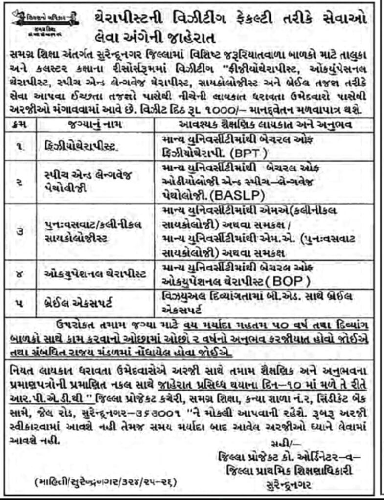 Samagra Shiksha Bharti 2025: સમગ્ર શિક્ષા (Samagra Shiksha) અભિયાન, સુરેન્દ્રનગર જિલ્લા દ્વારા જિલ્લા કક્ષાએ અને તાલુકા કક્ષાએ દિવ્યાંગ બાળકોના શિક્ષણ અને પુનર્વસનના કાર્યક્રમ હેઠળ વિવિધ તજજ્ઞોની જગ્યાઓ તદ્દન હંગામી ધોરણે, ૧૧ માસના કરાર આધારિત ભરવા માટે જાહેરાત બહાર પાડવામાં આવેલ છે.