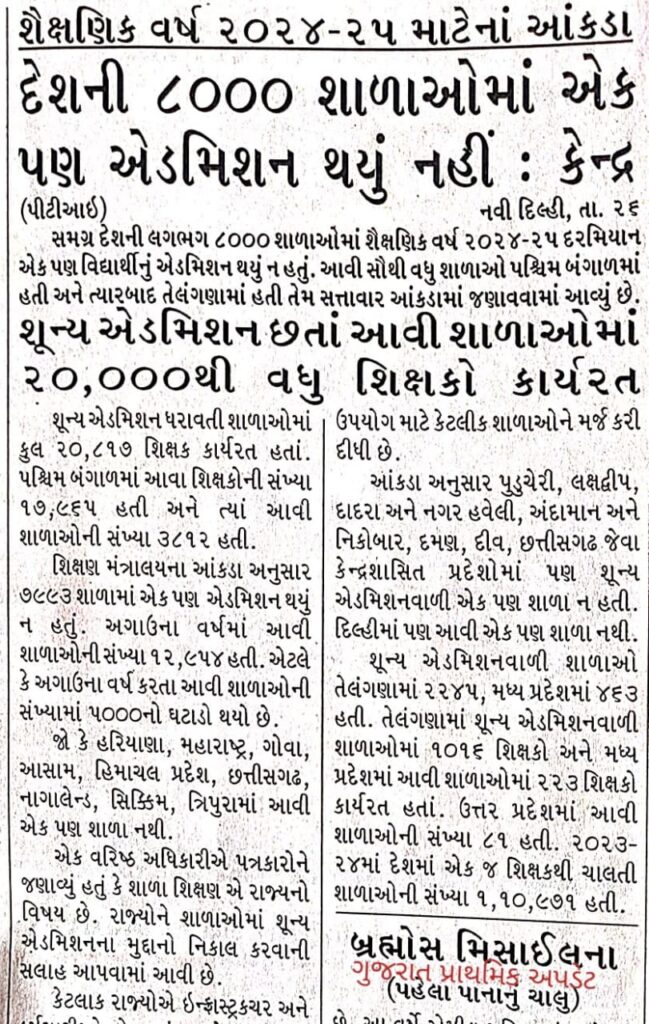 | શિક્ષણ મંત્રાલય દ્વારા તૈયાર કરાયેલા રાજ્યોમાં શાળાઓની સ્થિતિ અંગેના 2024-25ના અહેવાલમાં દર્શાવવામાં આવ્યું છે કે ગયા વર્ષની સરખામણીમાં શૂન્ય નોંધણી ધરાવતી શાળાઓની સંખ્યામાં નોંધપાત્ર સુધારો થયો છે. અગાઉ, આવી શાળાઓની સંખ્યા લગભગ 13,000 હતી, પરંતુ હવે તે ઘટીને 7,993 થઈ ગઈ છે. આમાંથી, એકલા પશ્ચિમ બંગાળમાં શૂન્ય નોંધણી ધરાવતી શાળાઓની સૌથી વધુ સંખ્યા છે, 3,812, અને 17,965 શિક્ષકોને તૈનાત કરવામાં આવ્યા છે. |