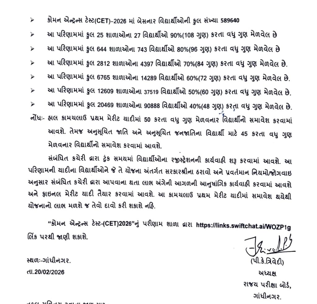 રાજ્ય પરીક્ષા બોર્ડ દ્વારા કોમન એન્ટ્રન્સ ટેસ્ટ (CET) 2026-27 માટે જાહેરાત. CET માટે Online Apply કેવી રીતે કરશોNice! અહીં છે — Gujarat CET (Common Entrance Test) — ઓનલાઇન apply કરવાની સરળ માર્ગદર્શિકા 👇ગુજરાત રાજ્ય સરકાર દ્વારા શૈક્ષણિક વર્ષ 2026-27 માટે CET (Common Entrance Test) યોજાશે, જેનાથી રાજ્યની Grant-in-aid Schools, Government Schools અને Self-Finance Schools માં Class 6 Admission Merit List તૈયાર કરવામાં આવશે. આ ટેસ્ટ ‘Knowledge Enhancement’ અને ‘Learning Outcome’ આધારિત રહેશે.