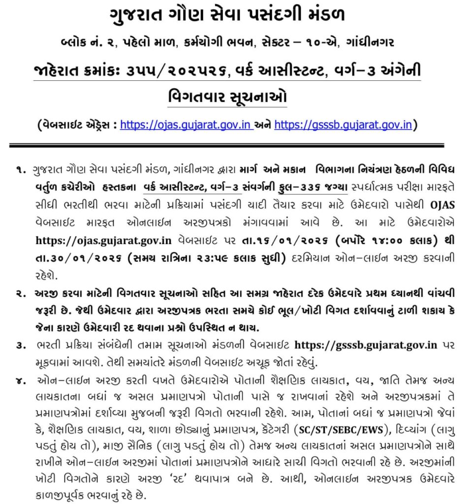 ઉમેદવારો ઓનલાઈન અરજી માટે ojas.gujarat.gov.in અને ભરતી સંબંધિત તમામ અપડેટ માટે gsssb.gujarat.gov.in વેબસાઇટ નિયમિત રીતે ચેક કરતા રહેવા સૂચવવામાં આવ્યા છે.