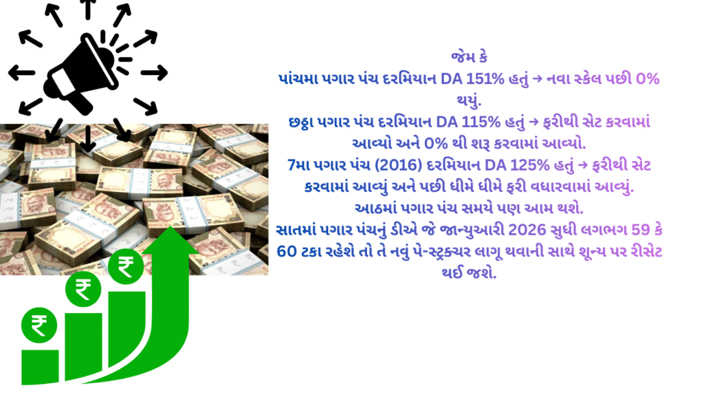 સાતમાં પગાર પંચનું ડીએ જે જાન્યુઆરી 2026 સુધી લગભગ 59 કે 60 ટકા રહેશે તો તે નવું પે-સ્ટ્રક્ચર લાગૂ થવાની સાથે શૂન્ય પર રીસેટ થઈ જશે.