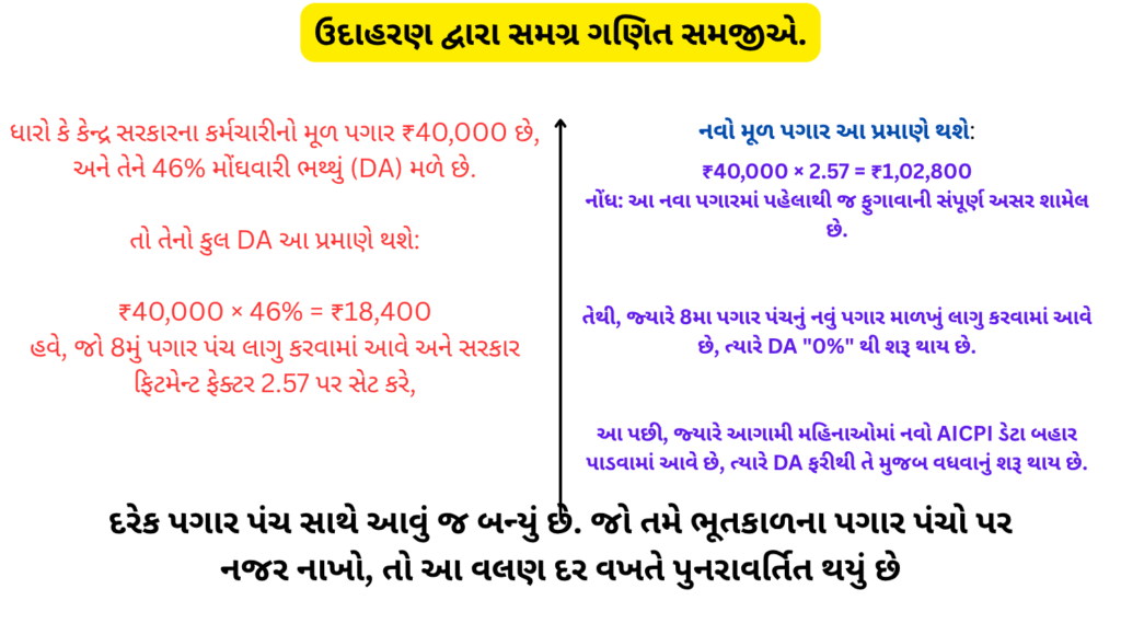 | જ્યારે પણ નવું પગાર પંચ લાગૂ થાય છે, ત્યારે તે સમયની બધી મોંઘવારીની અસર (Inflation Impact) ને પહેલાથી જ નવા Basic Pay માં સામેલ કરી લેવામાં આવે છે. |