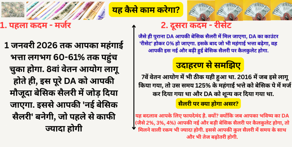 - By January 1, 2026, your dearness allowance will have reached approximately 60-61%. Once the 8th Pay Commission is implemented, this entire DA will be added to your current basic salary. This will create your ‘new basic salary,’ which will be significantly higher than before.