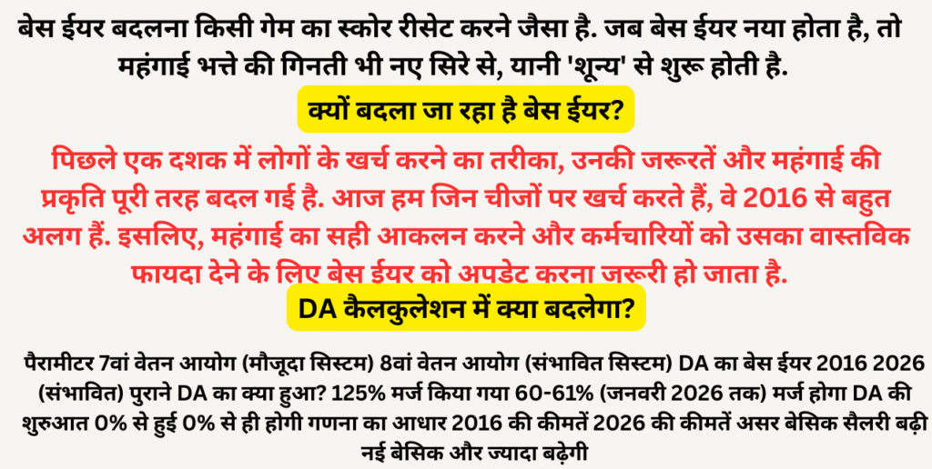 अब जब 8वां वेतन आयोग 1 जनवरी 2026 से लागू होना है, तो सरकार DA की गणना के लिए बेस ईयर को भी बदलकर 2026 कर सकती है.