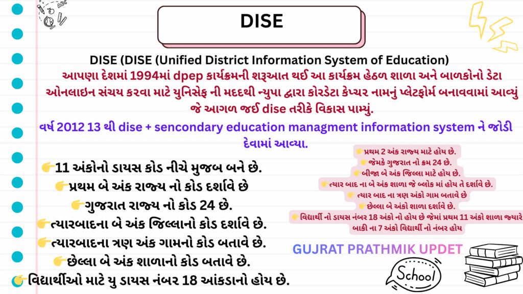 ભારત સરકારના માનવ સંસાધન અને વિકાસ વિભાગ (MHRD), નવી દિલ્હી દ્વારા DISE સોફ્ટવેર તૈયાર કરવામાં આવેલ છે. આ સિસ્ટમ સર્વ શિક્ષા અભિયાન મારફત વર્ષ 2001 થી કાર્યરત છે.