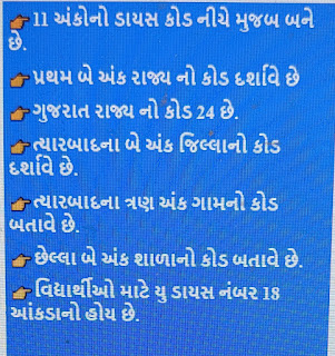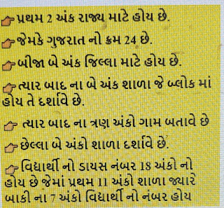 👉પ્રથમ 2 અંક રાજ્ય માટે હોય છે. 👉જેમકે ગુજરાત નો ક્રમ 24 છે. 👉બીજા બે અંક જિલ્લા માટે હોય છે. 👉ત્યાર બાદ ના બે અંક શાળા જે બ્લોક માં હોય તે દર્શાવે છે. 👉 ત્યાર બાદ ના ત્રણ અંકો ગામ બતાવે છે 👉છેલ્લા બે અંકો શાળા દર્શાવે છે. 👉વિદ્યાર્થી નો ડાયસ નંબર 18 અંકો નો હોય છે જેમાં પ્રથમ 11 અંકો શાળા જ્યારે બાકી ના 7 અંકો વિદ્યાર્થી નો નંબર હોય