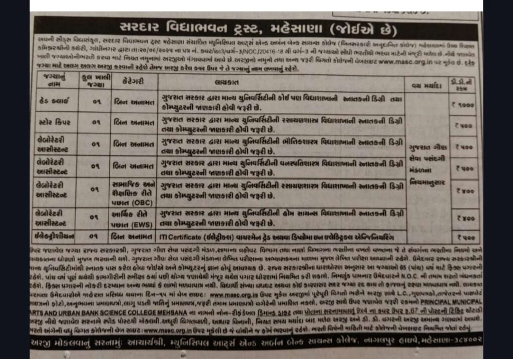 Mehsana bharti 2025, મહેસાણા ભરતી 2025 : મહેસાણામાં સારા પગારની નોકરી શોધી રહેલા લોકો માટે નોકરીના સારા સમાચાર આવી ગયા છે. સરદાર વિદ્યાભવન ટ્રસ્ટ દ્વારા મ્યુનિસિપલ આર્ટ્સ એન્ડ અર્બન સાયન્સ કોલેજ દ્વારા વિવિધ પોસ્ટ માટે ભરતીની જાહેરાત બહાર પાડી છે. હેડ ક્લાર્કથી લઈને ઈલેક્ટ્રીશીયન વિવિધ પોસ્ટની કુલ 7 જગ્યાઓ ઉપર લાયક ઉમેદવારો પસંદ કરવા માટે સંસ્થાએ ઓફલાઈન અરજીઓ મંગાવી છે.
