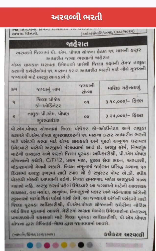 Gujarat Bharti 2025, Arvalli bharti 2025 : અરવલ્લી જિલ્લામાં રહેતા અને નોકરી શોધી રહેલા યુવાનો માટે નોકરીના સારા સમાચાર આવી ગયા છે. અરવલ્લી જિલ્લામાં પી.એમ. પોષણ યોજના હેઠળ 11 માસની કરાર આધારીત જિલ્લા પ્રોજેક્ટ કો ઓર્ડિનેટર અને તાલુકા પી.એમ. પોષણ સુપરવાઈઝરની કુલ 05 જગ્યાઓ ભરવા માટે જાહેરાત બહાર પાડી છે.