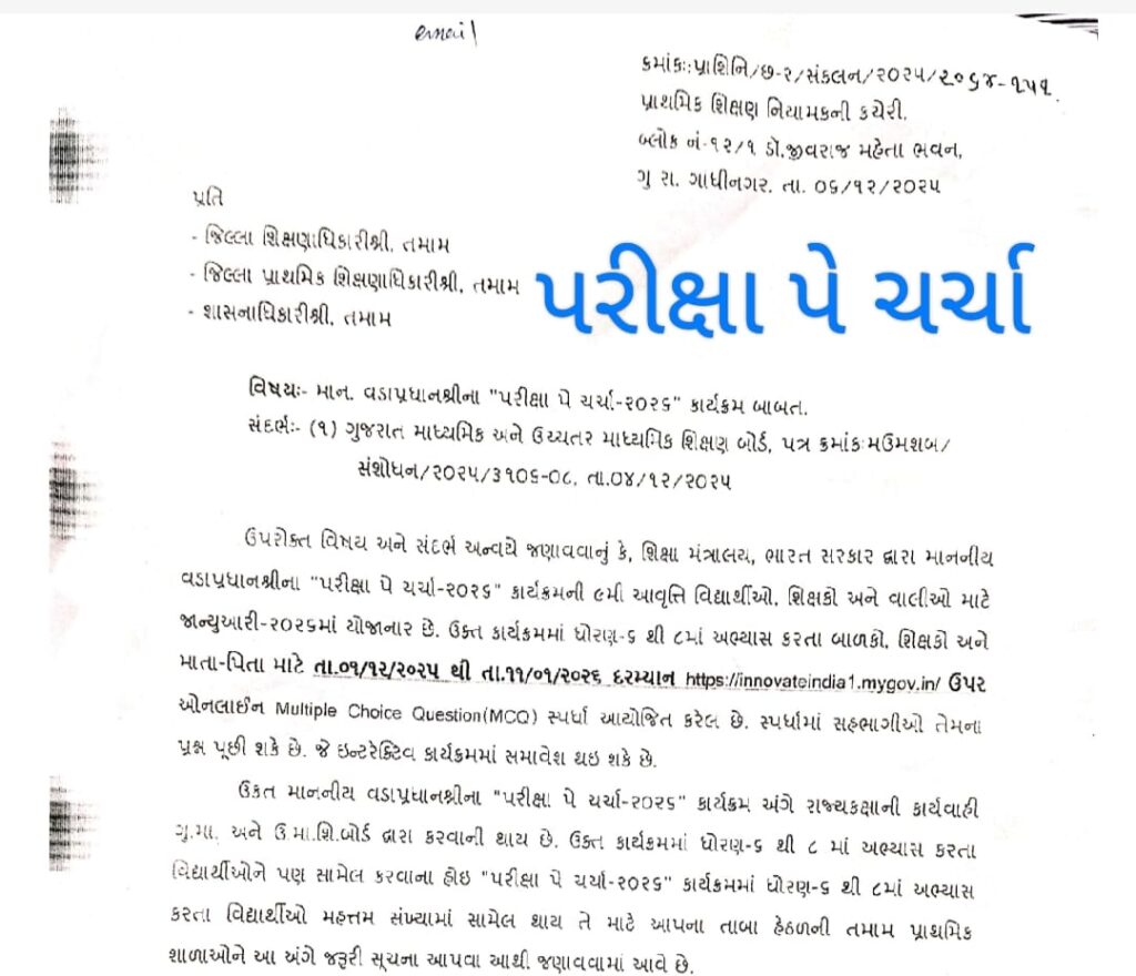 ઉગતો માન્ય વડાપ્રધાન શ્રી ના પરીક્ષા પે ચર્ચા કાર્યક્રમ અંગે રાજ્ય કક્ષાની કાર્યવાહી ગુજરાત માધ્યમિક અને ઉચ્ચતર માધ્યમિક શિક્ષણ બોર્ડ દ્વારા કરવાની થાય છે ઉપ્ત કાર્યક્રમમાં ધોરણ છ થી આઠમો અભ્યાસ કરતા વિદ્યાર્થીઓને પણ સામેલ કરવાના હોય પરીક્ષા પે ચર્ચા 2026 કાર્યક્રમમાં ધોરણ છ થી આઠ ના અભ્યાસ કરતા વિદ્યાર્થીઓ મહત્તમ જોડાય