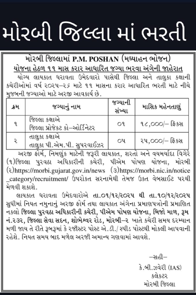 morbi જિલ્લામાં PM Poshan Yojana એટલે કે MDM યોજના હેઠળ District Project Co-ordinator અને MDM Supervisor માટે નવી ભરતી જાહેર થઈ છે. જો તમે સરકારી યોજનાથી જોડાયેલ સ્થિર અને જવાબદારીવાળી નોકરી શોધી રહ્યા હો, તો આ મોકો ચોક્કસ ધ્યાનમાં લેવાનું છે.