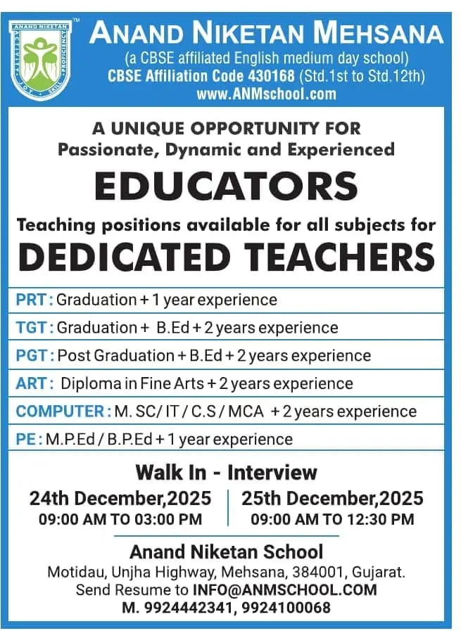 CBSE Recruitment: મહેસાણા શહેર ખાતે સ્થિત એક પ્રતિષ્ઠિત CBSE સંલગ્ન અંગ્રેજી માધ્યમની શાળામાં વર્ષ 2025–26 માટે વિવિધ વિષયોમાં અનુભવી અને ઉત્સાહી શિક્ષકોની ભરતી માટે વોક-ઇન ઇન્ટરવ્યુનું આયોજન કરવામાં આવ્યું છે. આ શાળા ધોરણ 1 થી ધોરણ 12 સુધીનું શિક્ષણ આપે છે અને ગુણવત્તાયુક્ત શિક્ષણ, શિસ્તબદ્ધ વાતાવરણ અને આધુનિક શિક્ષણ પદ્ધતિ માટે જાણીતી છે. શિક્ષણ ક્ષેત્રમાં કારકિર્દી બનાવવા ઇચ્છુક અને સમર્પિત શિક્ષકો માટે આ એક ઉત્તમ તક છે.