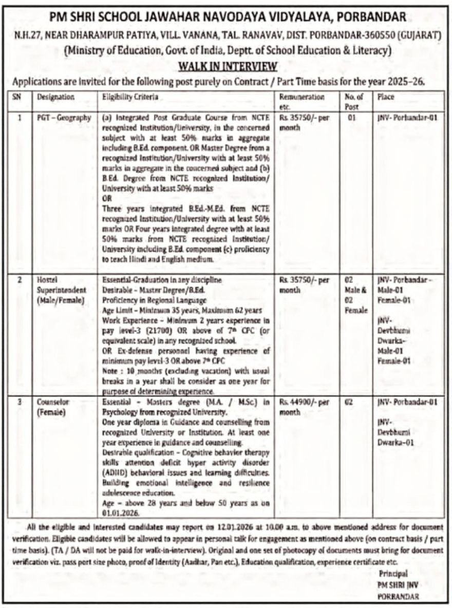 જવાહર નવોદય વિદ્યાલય (PM SHRI School) દ્વારા શૈક્ષણિક વર્ષ 2025-26 માટે વિવિધ શૈક્ષણિક અને બિન-શૈક્ષણિક હોદ્દાઓ માટે કરાર આધારિત તથા પાર્ટ ટાઇમ ધોરણે ભરતી જાહેર કરવામાં આવી છે. આ ભરતી ભારત સરકારના શિક્ષણ મંત્રાલય હેઠળ કાર્યરત નવોદય વિદ્યાલય સમિતિ દ્વારા આયોજિત છે. લાયક અને રસ ધરાવતા ઉમેદવારોને સીધા વોક-ઇન-ઇન્ટરવ્યૂ દ્વારા પસંદ કરવામાં આવશે.