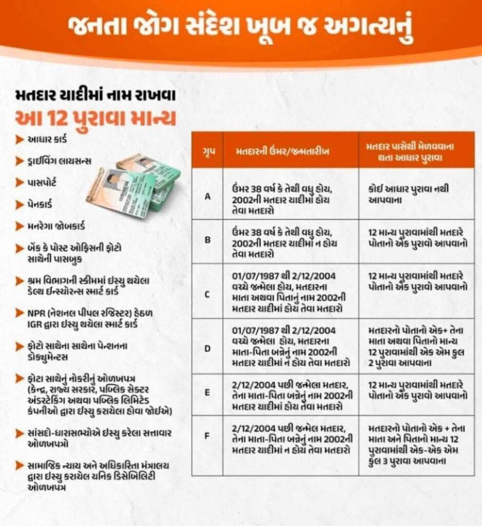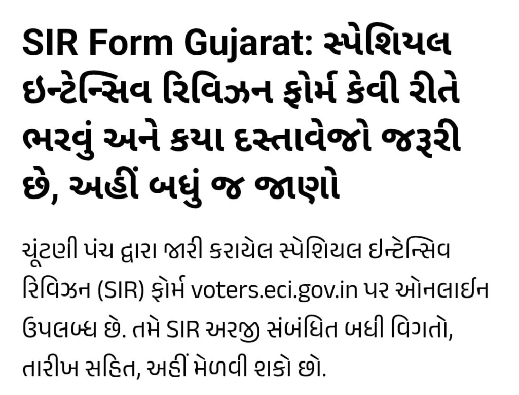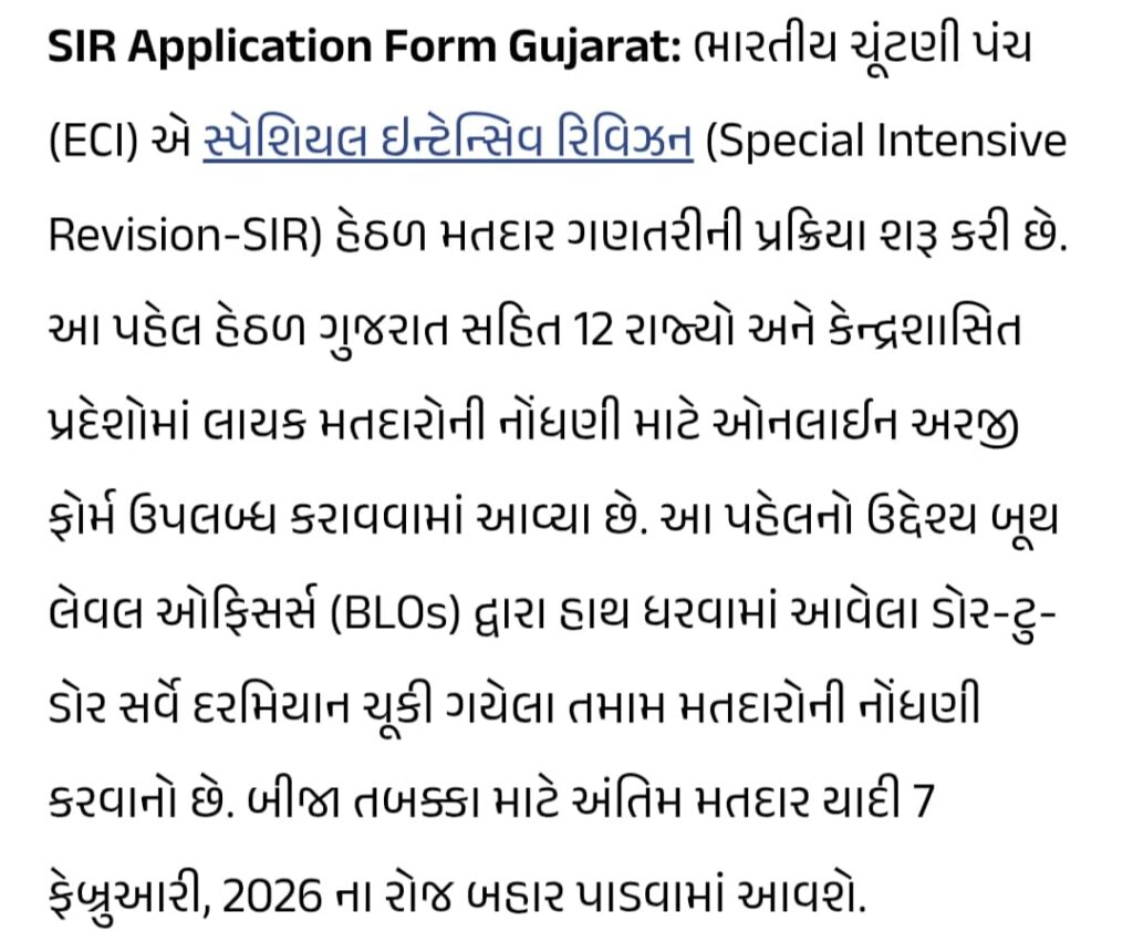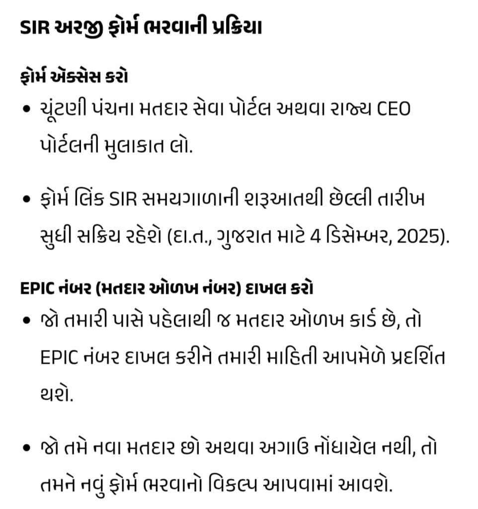 SIR નો અર્થ છે Special Intensive Revision — મતદાર-યાદી (electoral roll) નું એક વિશેષ અને ઘનતાપ્રધાન સમીક્ષા અભિયાન. તેનો ઉદ્દેશ voter’s list ને જથ્થાબંધ અને સચોટ બનાવવો છે — અકથિત ડુપ્લિકેટ્સ દૂર કરવા, અજ્ઞાત રહેલા અથવા નાગરિકતાના અર્થમાં સાથે સંબંધિત ભૂલો સુધારવા અને નવા પંખાબજારો (migrants, new voters) નું પ્રમાણિત સમાવેશ કરવાં.